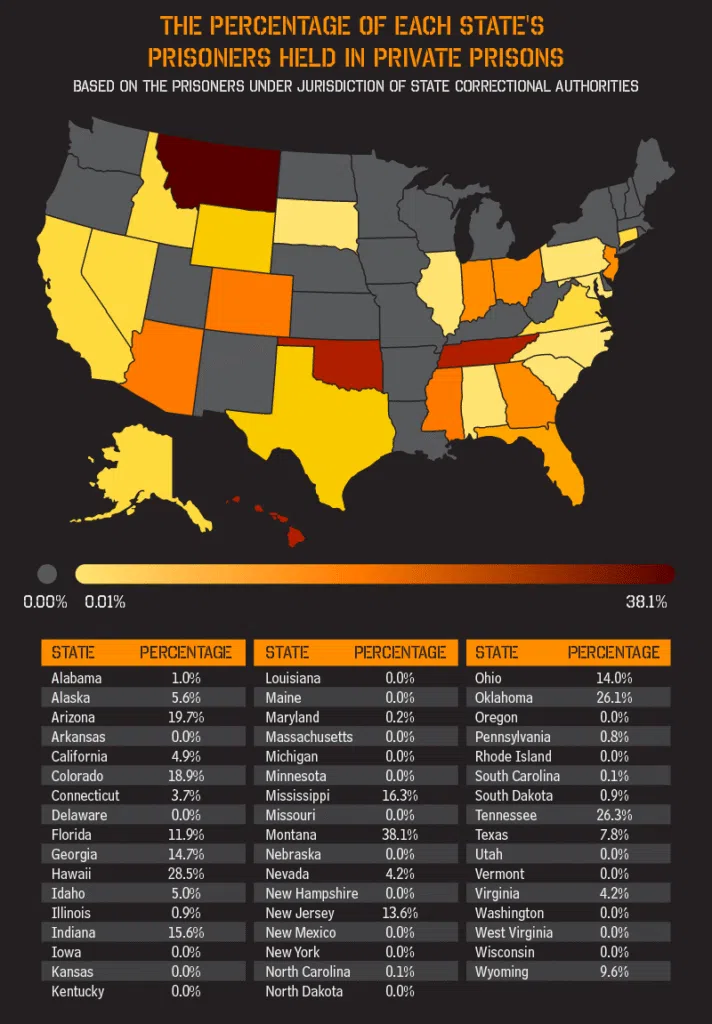 Montana has the highest percentage of prisoners in a private prison with 38.1%, followed by Hawaii with 28.5% and Tennessee with 26.3%. On the opposite end of the spectrum, North and South Carolina have the lowest percentage of private prisoners with 0.1%.
